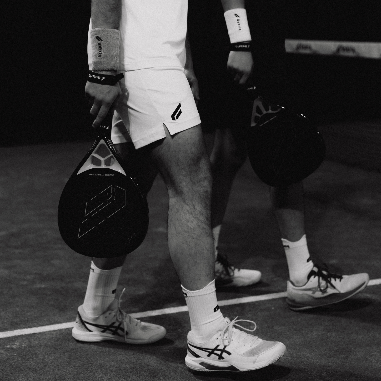 Two athletes wearing the Performance Short White, holding their rackets on the padel court, demonstrating the shorts’ fit and comfort during a match.